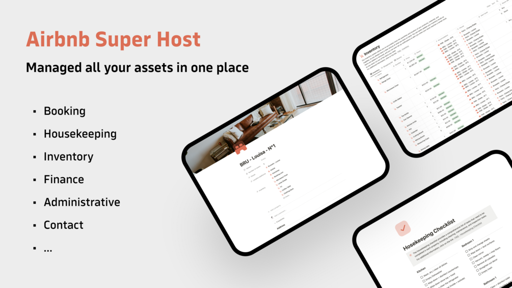 Attention all Airbnb hosts! Take your hosting to the next level with the Notion Airbnb Super Host digital template. This comprehensive template is the ultimate tool for managing your Airbnb properties and guests. With features like task management, reservation tracking, inventory, financial tools, contact management, housekeeping checklist, … you'll be able to provide top-notch service with ease. Plus, the user-friendly design makes it easy to keep everything organized and at your fingertips. Whether you're a seasoned host or just starting out, the Notion Airbnb Super Host template will help you become a Super Host in no time. Don't miss out on this essential tool for optimizing your hosting process!