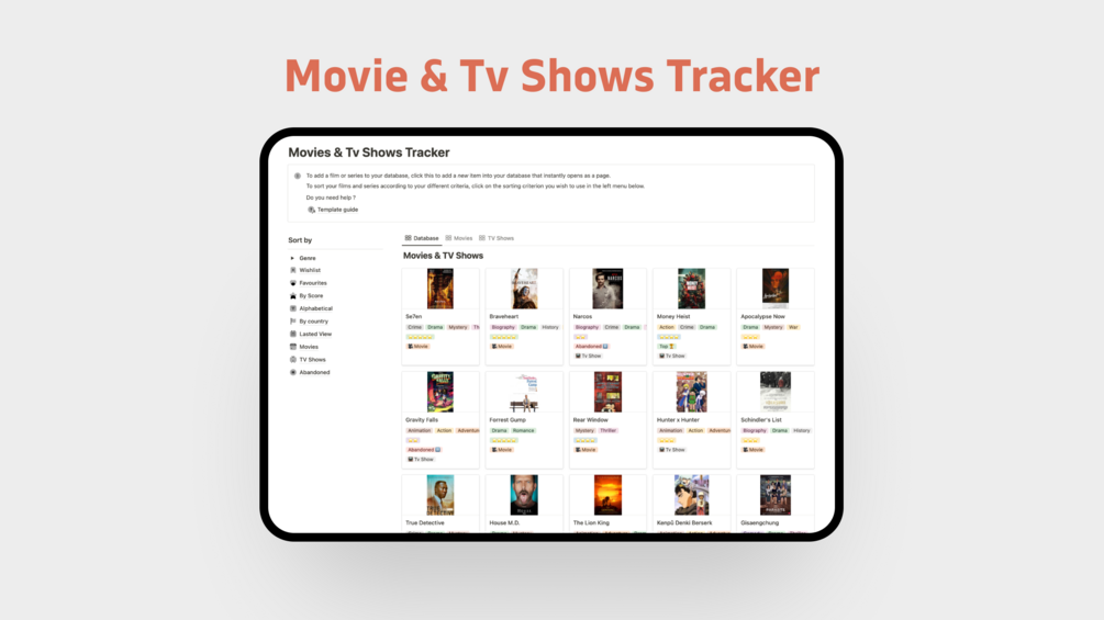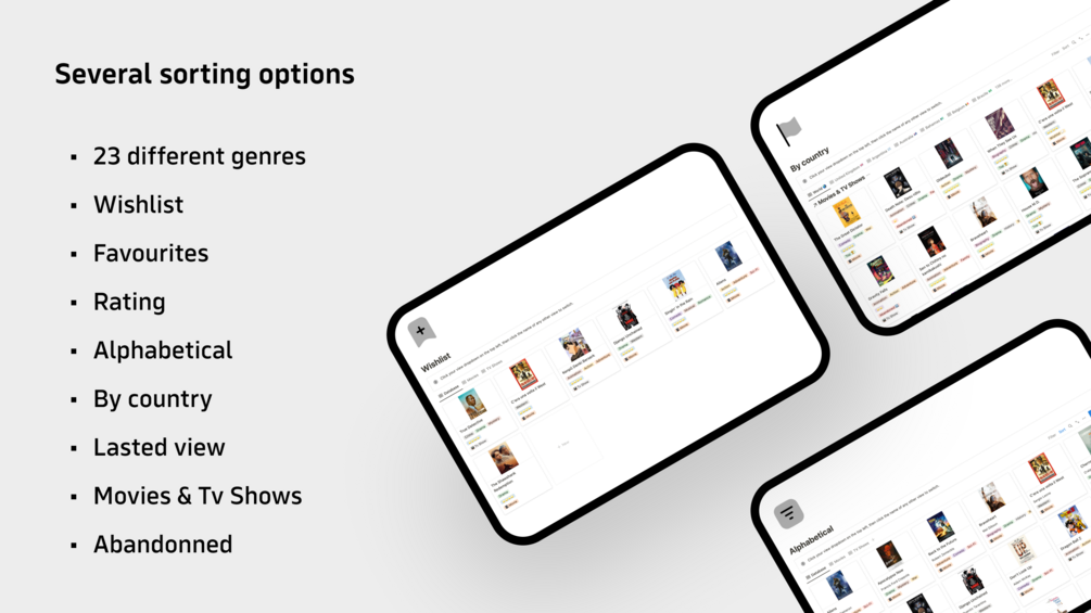 Easy Sorting: Sorting panel to the left will sort your life. Movie tracker integrates ‘sort by genre, wishlist, score, alphabet, country’ etc. so you never waste time on something you don’t end up liking.